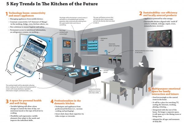 development of the kitchen as a ‘smart’ room; hyper-connected and technologically advanced. In order to cement its new position as the centre of the home, the kitchen will begin to take connectivity and smart appliances into account with “mobile and wearable devices, and will not only make shopping and laundry easier, but ensure endless access to information from the Internet of Things.” Smart appliances are likely to also make their presence felt, with worktops able to cook, make calls, broadcast TV and provide access to the Internet. And in case you wanted to cut down on the amount of shelf space being taken up by cooking books, these smart worktops may contain databases of recipes where chefs can guide you through the process.